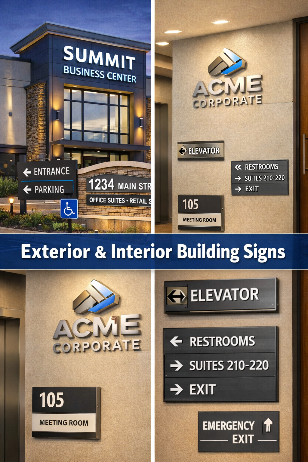 Exterior and interior building signs clearly identify, guide, and brand spaces while enhancing visibility, safety, and professional appearance.