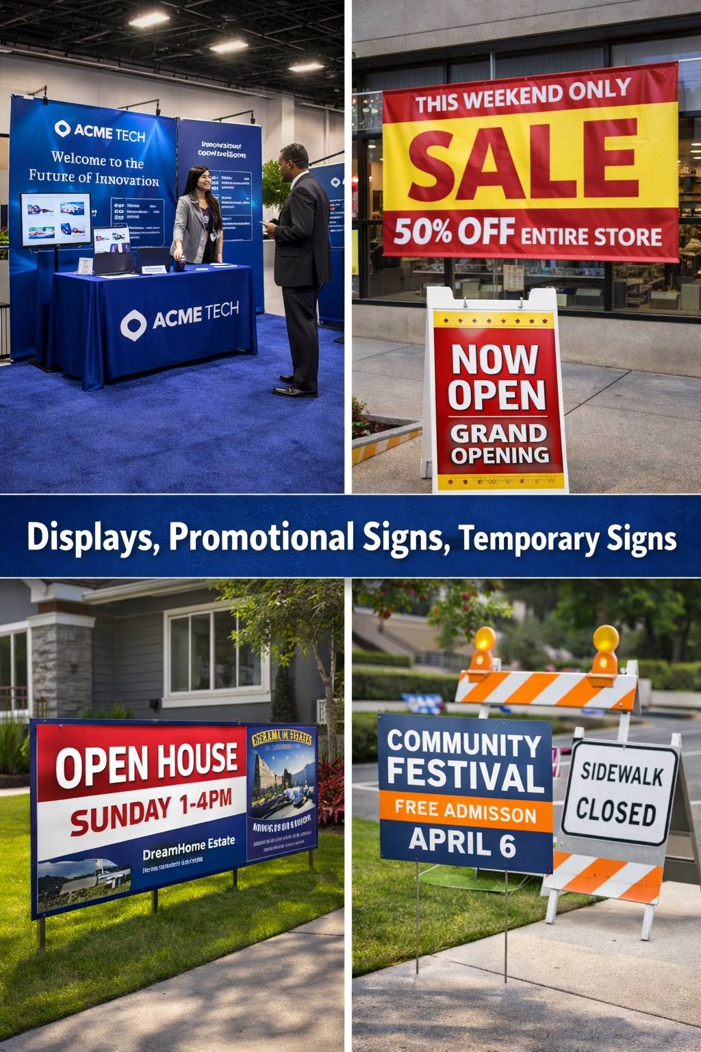 Together, displays, promotional signs, and temporary signs provide fast, affordable, and high-visibility solutions that support short-term marketing goals while maintaining strong visual communication and brand presence.