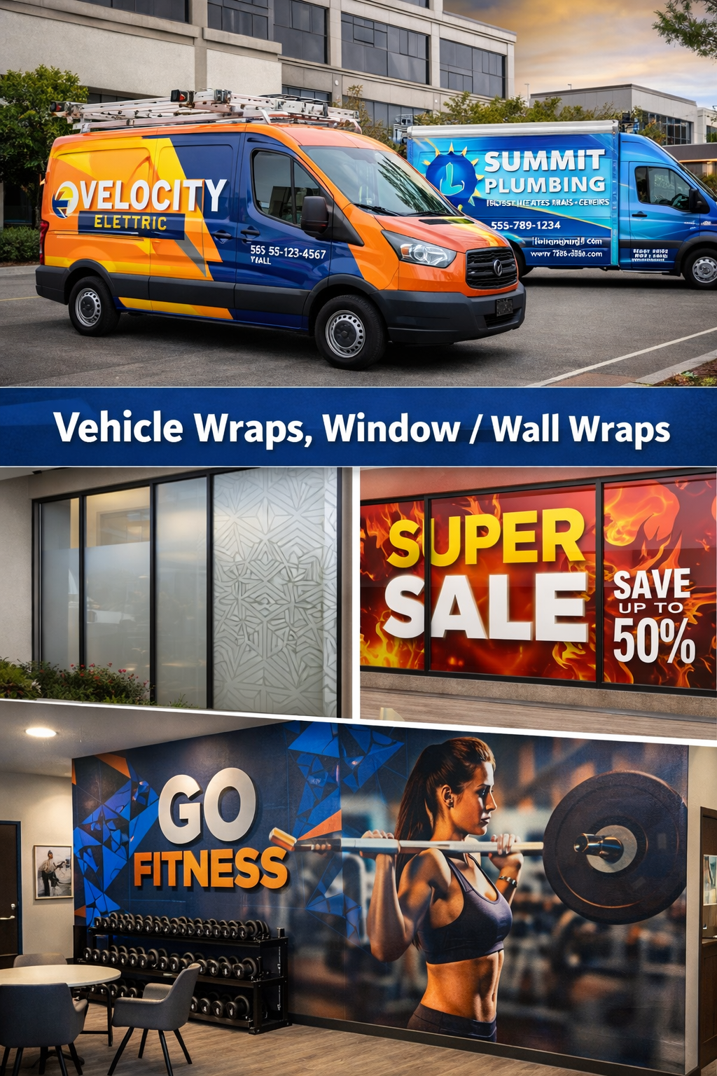 Together, vehicle, window, and wall wraps provide a flexible, cost-effective, and visually striking signage solution that boosts brand recognition, supports marketing campaigns, and creates a consistent, professional image across all touchpoints.